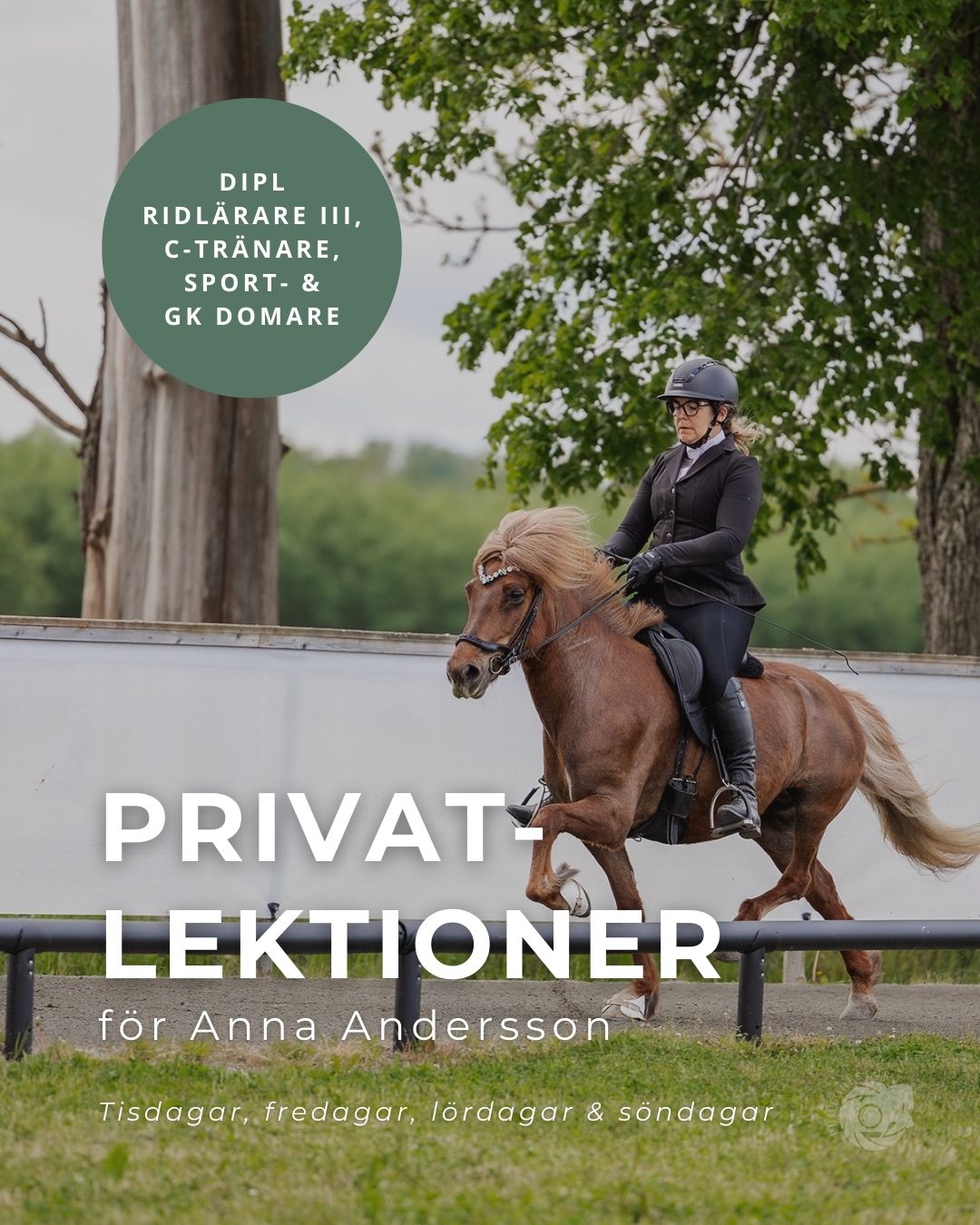 Välkommen att boka privatlektion för Anna! Stående tider tisdagar, fredagar, lördagar och söndagar under våren.