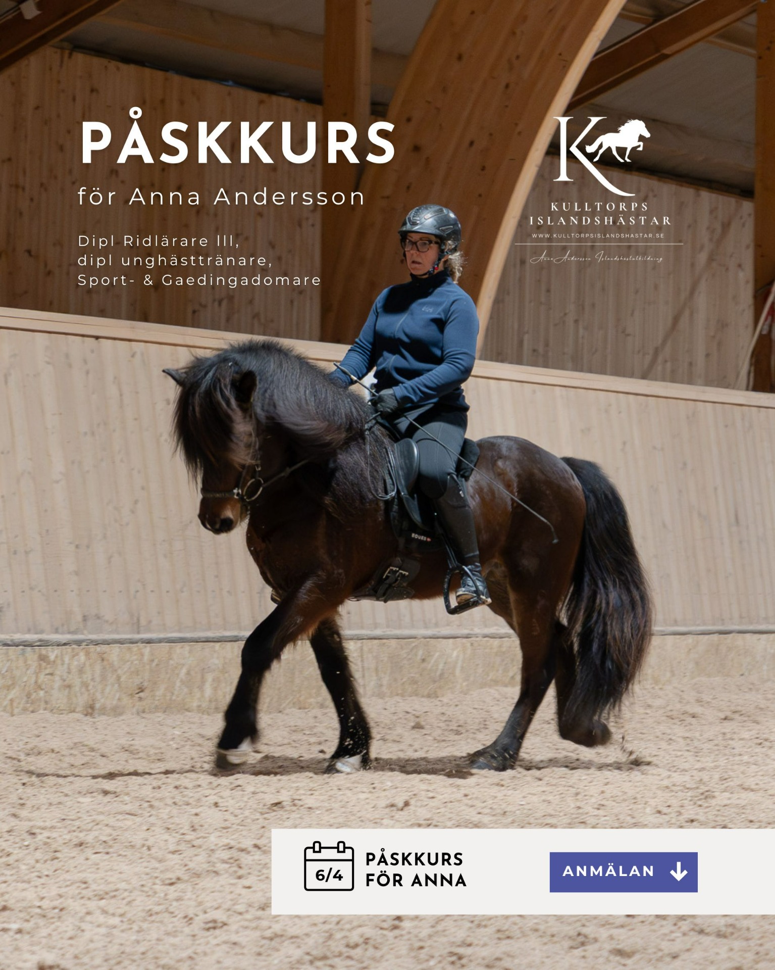 Kursen hålls på Kulltorp i Klockrike och leds av Anna Andersson, dipl. Ridlärare III och domare, med lång erfarenhet av att arbeta med ekipage på olika nivåer. Det här är en kurs för ridvana ryttare som vill fördjupa sin ridning – oavsett om målet är tävling eller fortsatt utveckling på hemmaplan.